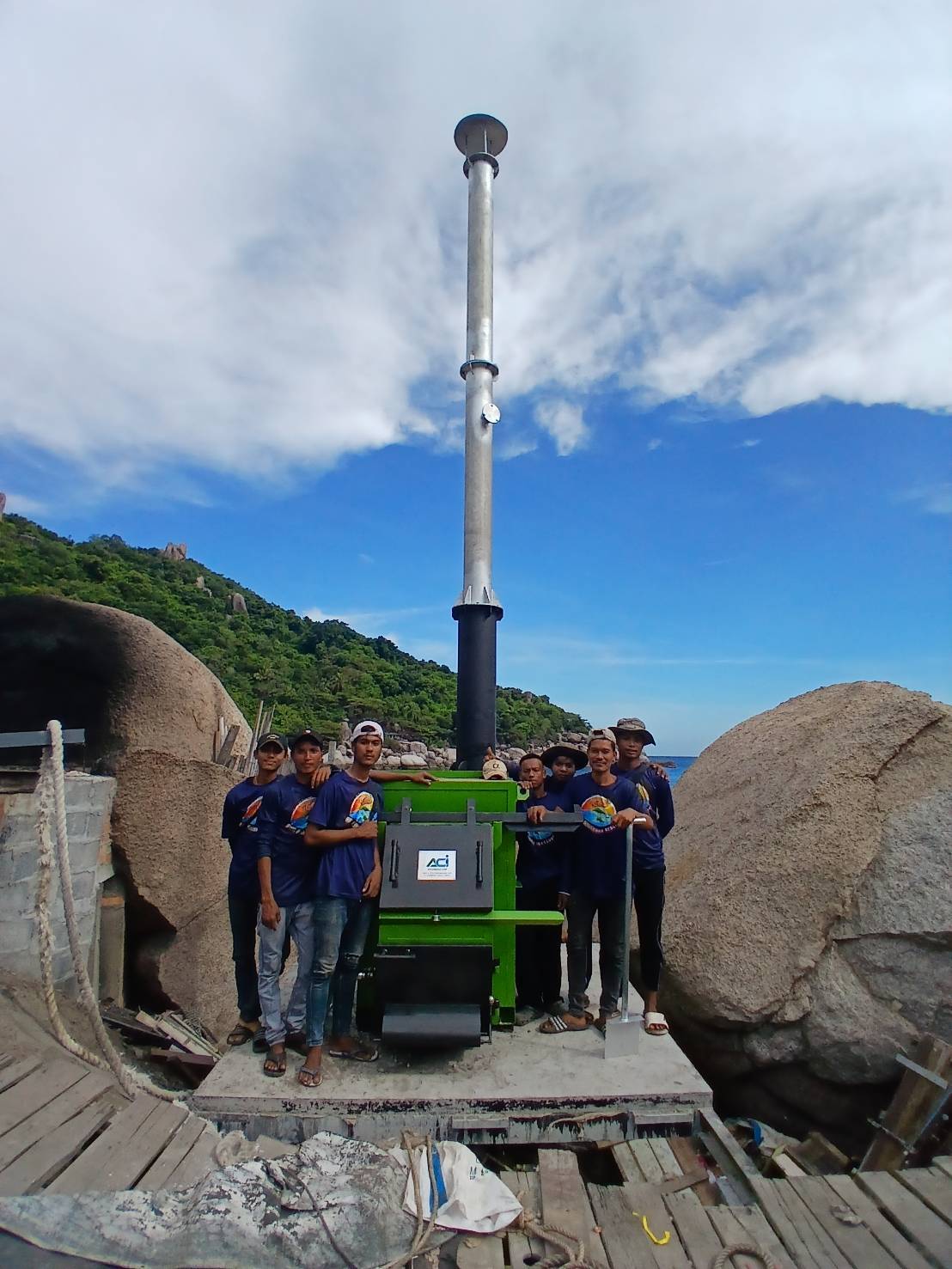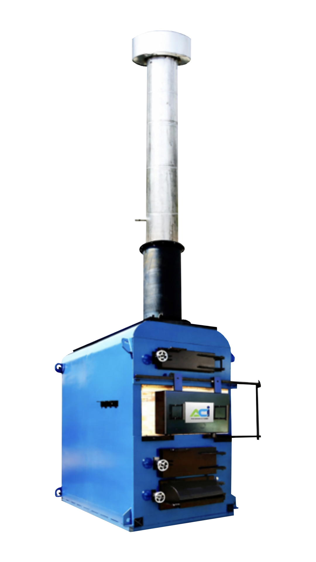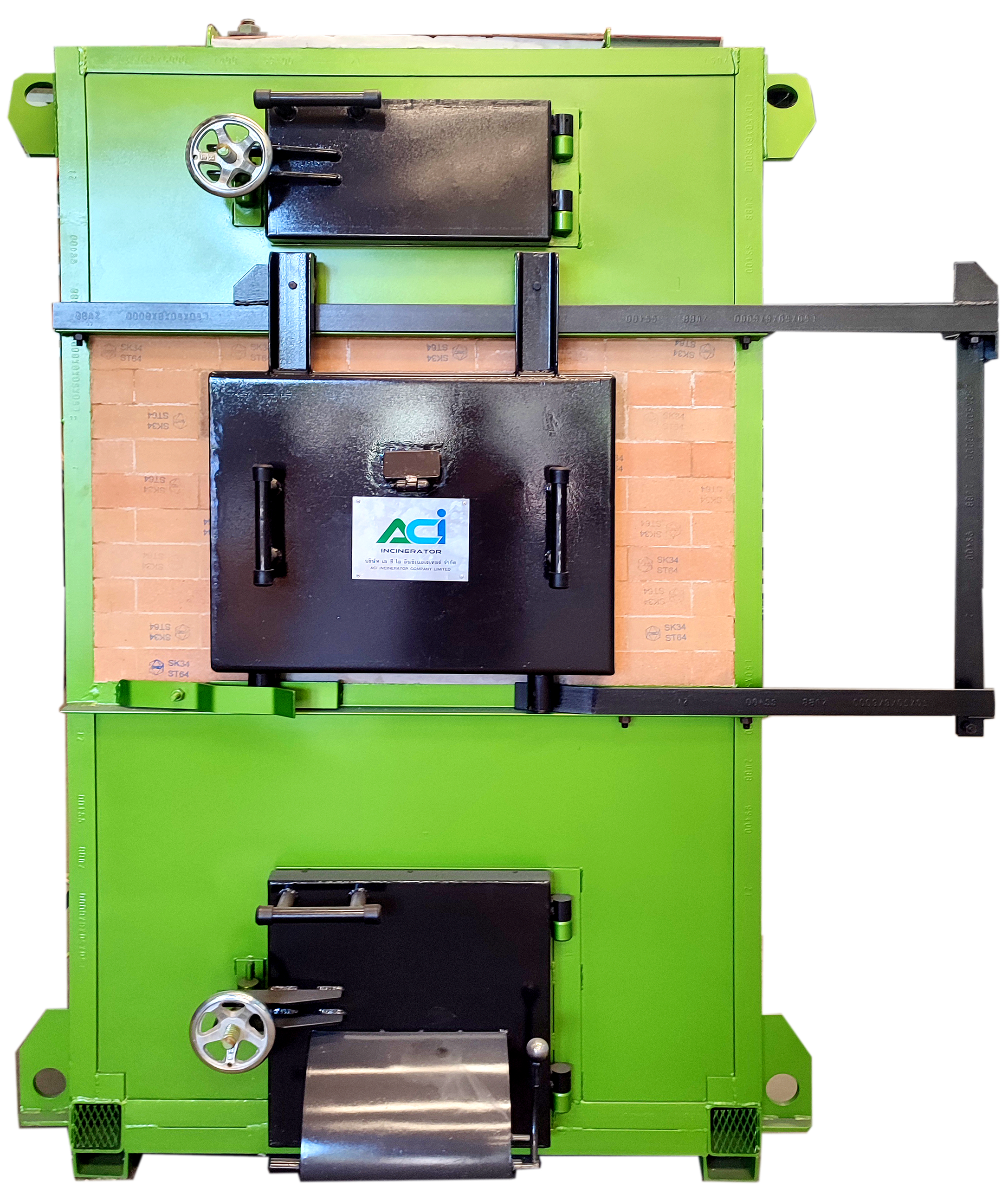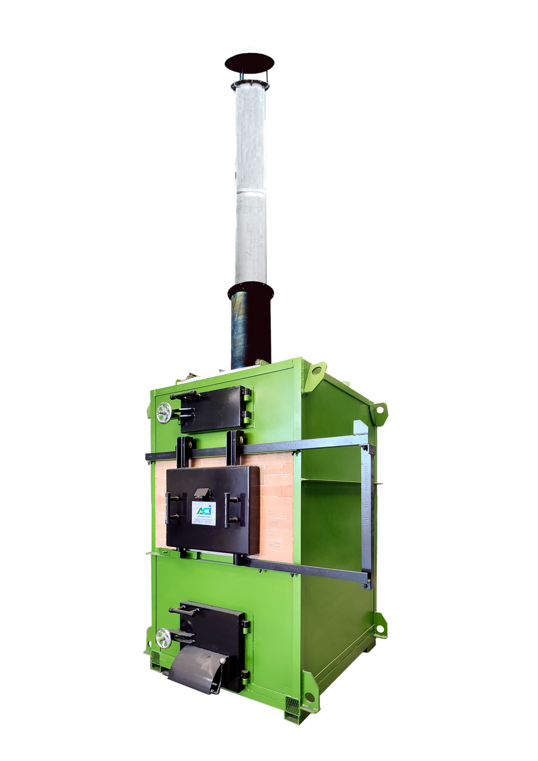 เตาเผาขยะสำเร็จรูป ระบบควบคุมอากาศ แบรนด์ ACI ผลิตในประเทศไทย เปลี่ยนขยะให้เป็นขี้เถ้าโดยใช้ขยะเป็นเชื้อเพลิง ไม่ต้องใช้ไฟฟ้า น้ำมัน แก๊ส เครื่องอัดอากาศ ช่วยในการเผาไหม้ ประกอบด้วยห้องเผาไหม้ 2-3 ห้อง ความร้อนที่เกิดจากการเผาไหม้ขยะจะถูกเก็บสะสมอยู่ภายในห้องเผาไหม้ และถูกปล่อยออกจากปล่องควันด้วยอัตราการไหลเวียนความร้อนที่เหมาะสม เพื่อสร้างความร้อนที่สม่ำเสมอ
